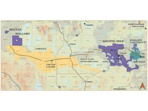 The Shining Tree Project is a district-scale gold property. It covers a large section of the Ridout Tyrrell deformation zone (RTDZ) which trends as far west as Newmont’s Borden Mine, through the area of IAMGOLD’s Cote Gold deposit, and across Aris Gold’s Juby Project.